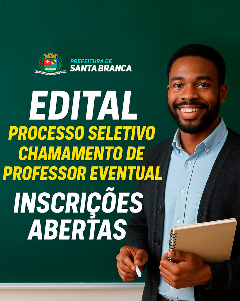 PROCESSO SELETIVO – PROFESSOR EVENTUALInscrições abertas de 16 a 25 de maio!Faça parte da rede municipal de ensino de Santa Branca 📍 Cadastramento para Professor I, II e III📌 Inscrição online ou presencial📄 Consulte o edital completo COMUNICADO SME Nº 22-2025- EDITAL DE PROCESSO SELETIVO SIMPLIFICADO Comunicado SME nº 24/2025 – Classificação Provisória Comunicado SME nº 25/2025 – Classificação Final Comunicado SME nº 27/2025 – ERRATA