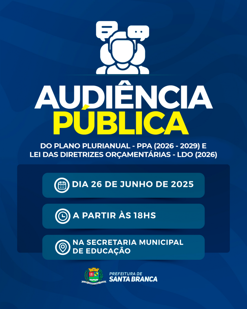AUDIÊNCIA PÚBLICA – PLANO PLURIANUAL (PPA) 2026-2029 E LEI DE DIRETRIZES ORÇAMENTÁRIAS (LDO) 2026 A Prefeitura de Santa Branca convida toda a população para participar da audiência pública que discutirá os principais instrumentos de planejamento e gestão do município para os próximos anos. 🗓 Data: 26 de junho de 2025 🕕 Horário: A partir das 18h 📍 Local: Secretaria Municipal de Educação Participe! Sua presença fortalece a transparência, o controle social e o compromisso com uma gestão participativa.